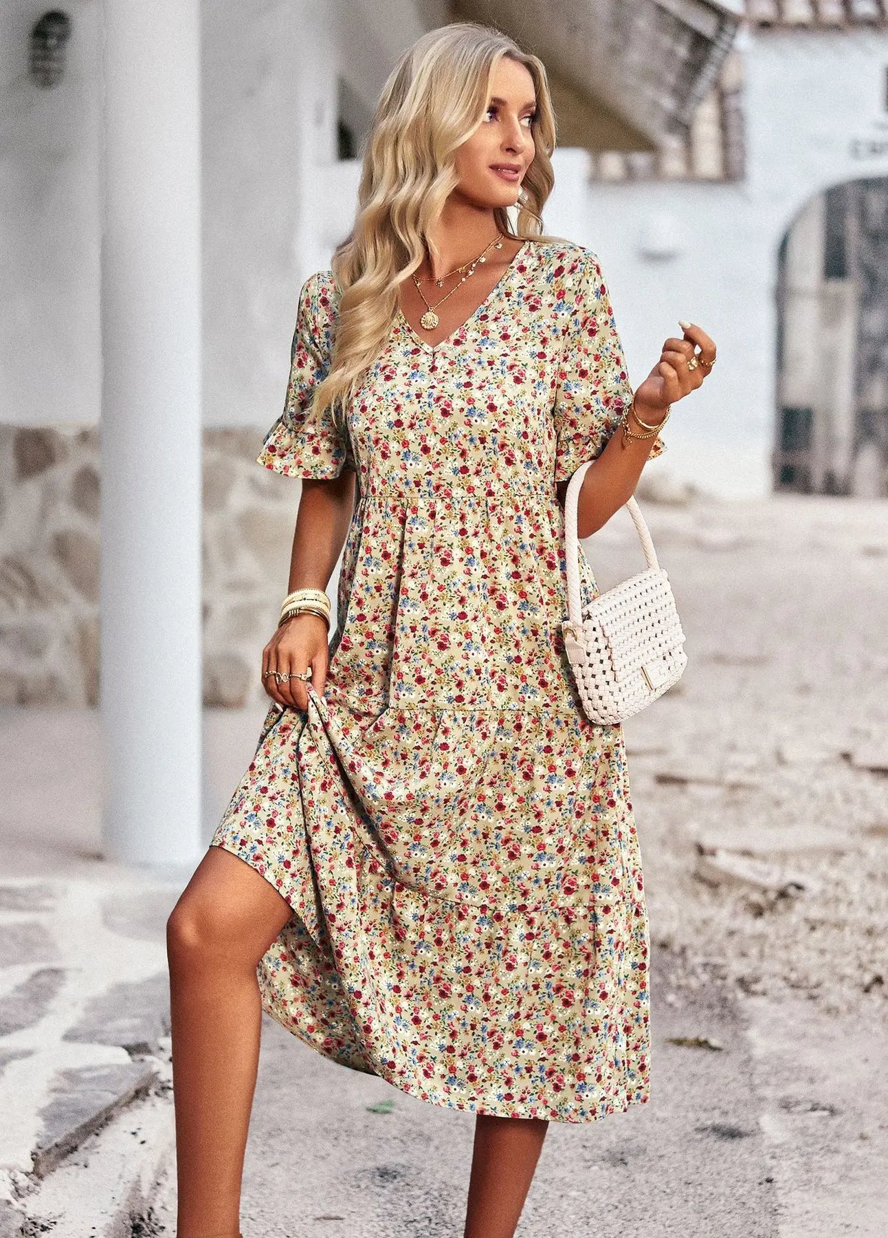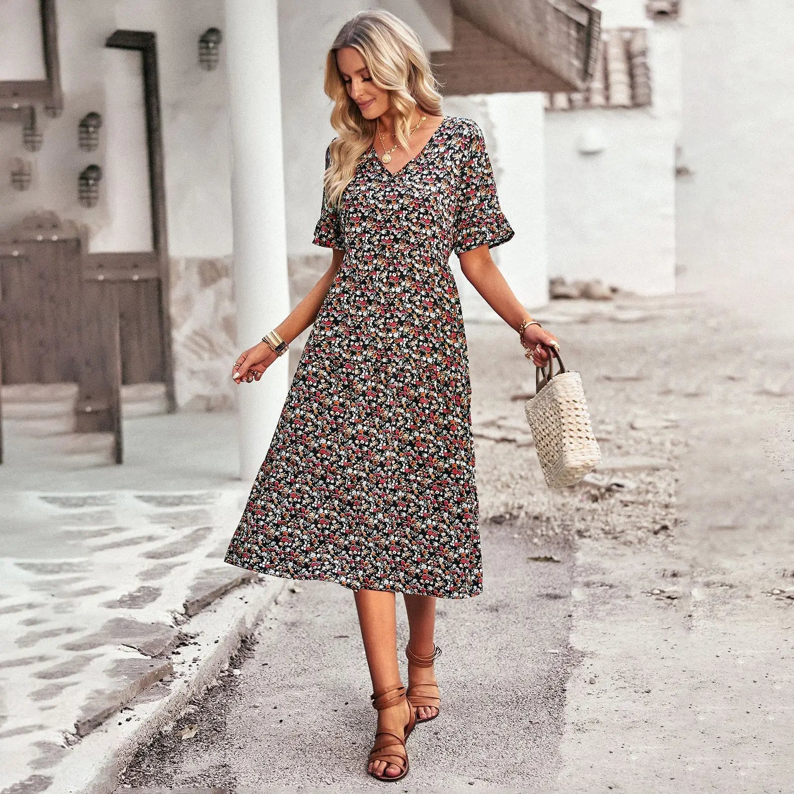 - Style: V-neck, mid-length vacation dress